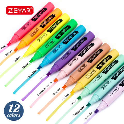 ZEYAR 12 Color Highlighter Pen Set Water-Based Quick Dry Chisel Tip Marker with 6 Macaron and 6 Fluorescent Colors